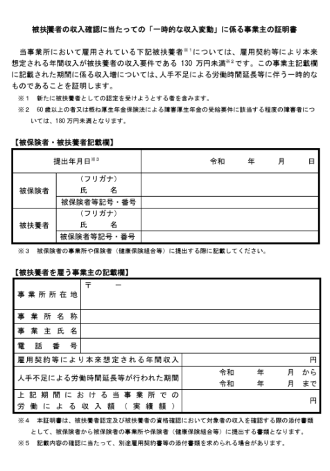 残業などで収入が一時的に扶養認定基準(年収130万円未満)を超えたとしても、事業主がその旨を証明すれば扶養に入ったままでいられる、というものです。